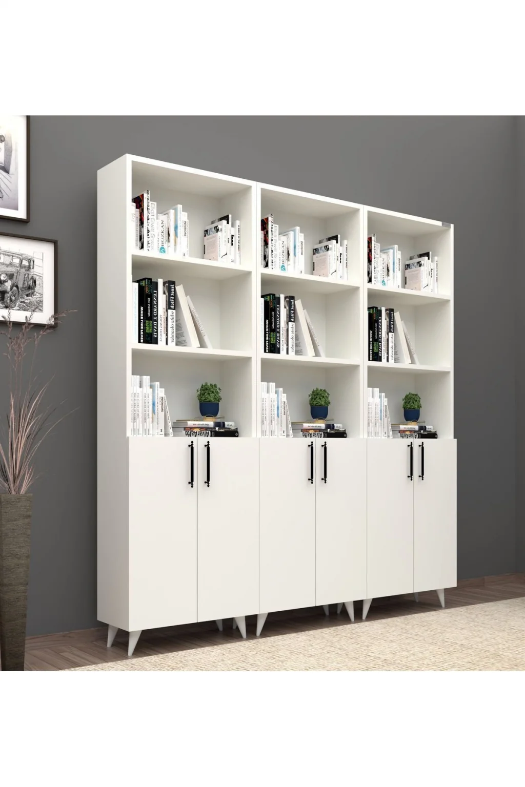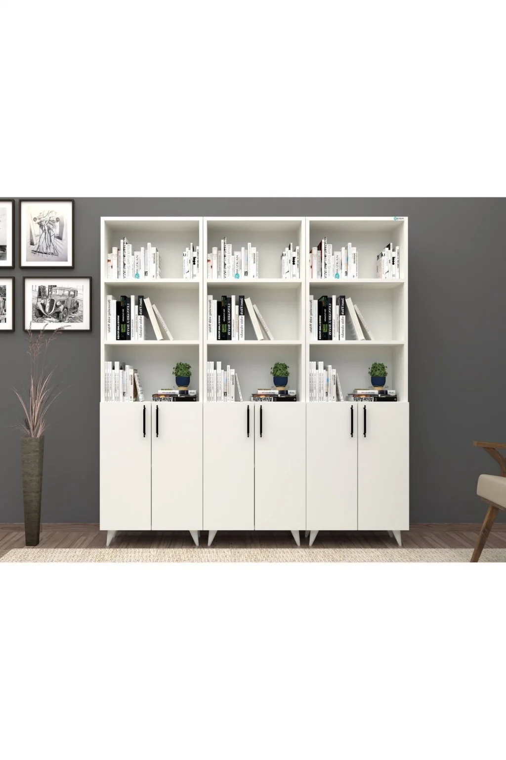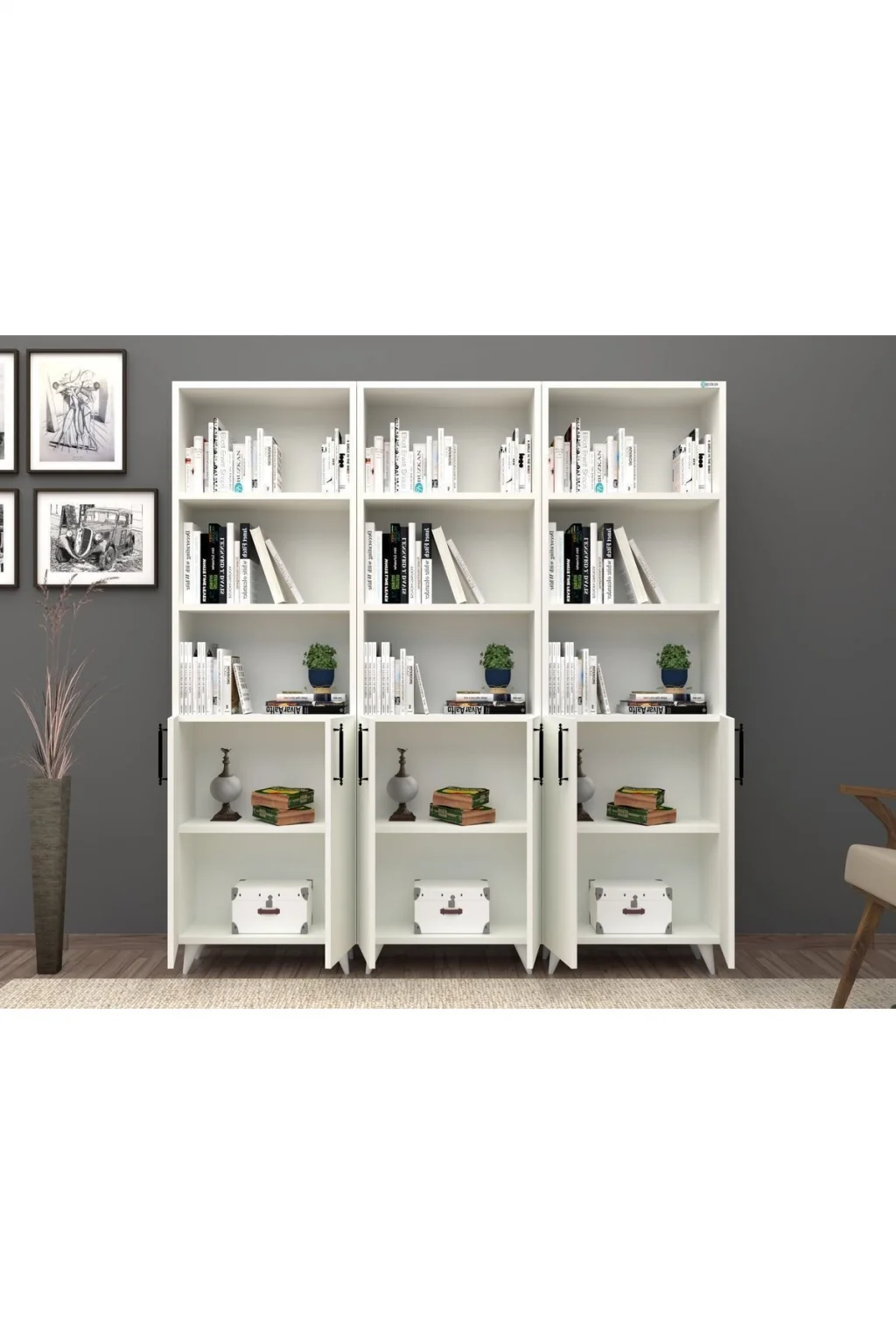- Modern ve şık tasarımıyla her ortama uyum sağlayan 12 raflı kitaplık, geniş depolama alanı sunar.; - 168 cm genişlik ve 179 cm yükseklik ölçüleriyle, kitaplarınızı ve dekoratif eşyalarınızı düzenli bir şekilde sergilemenizi sağlar.; - MDF gövde malzemesi sayesinde dayanıklılık ve uzun ömürlü kullanım vaat eder.; - Beyaz renk seçeneği ile mekanınıza aydınlık ve ferah bir hava katar.; - Kapaklı tasarımı, kitaplarınızı tozdan korurken, odanızın estetiğini de bozmadan saklamanızı sağlar.; - 25 cm derinliği ile kitaplarınızın ve diğer eşyalarınızın kolayca erişilebilir olmasını sağlar.; - Country tema ve klasik stilin modern dokunuşuyla, her dekorasyon tarzına uyum gösterir.; - Tek ebat tasarımı sayesinde evinizin her köşesine kolayca uyum sağlar.