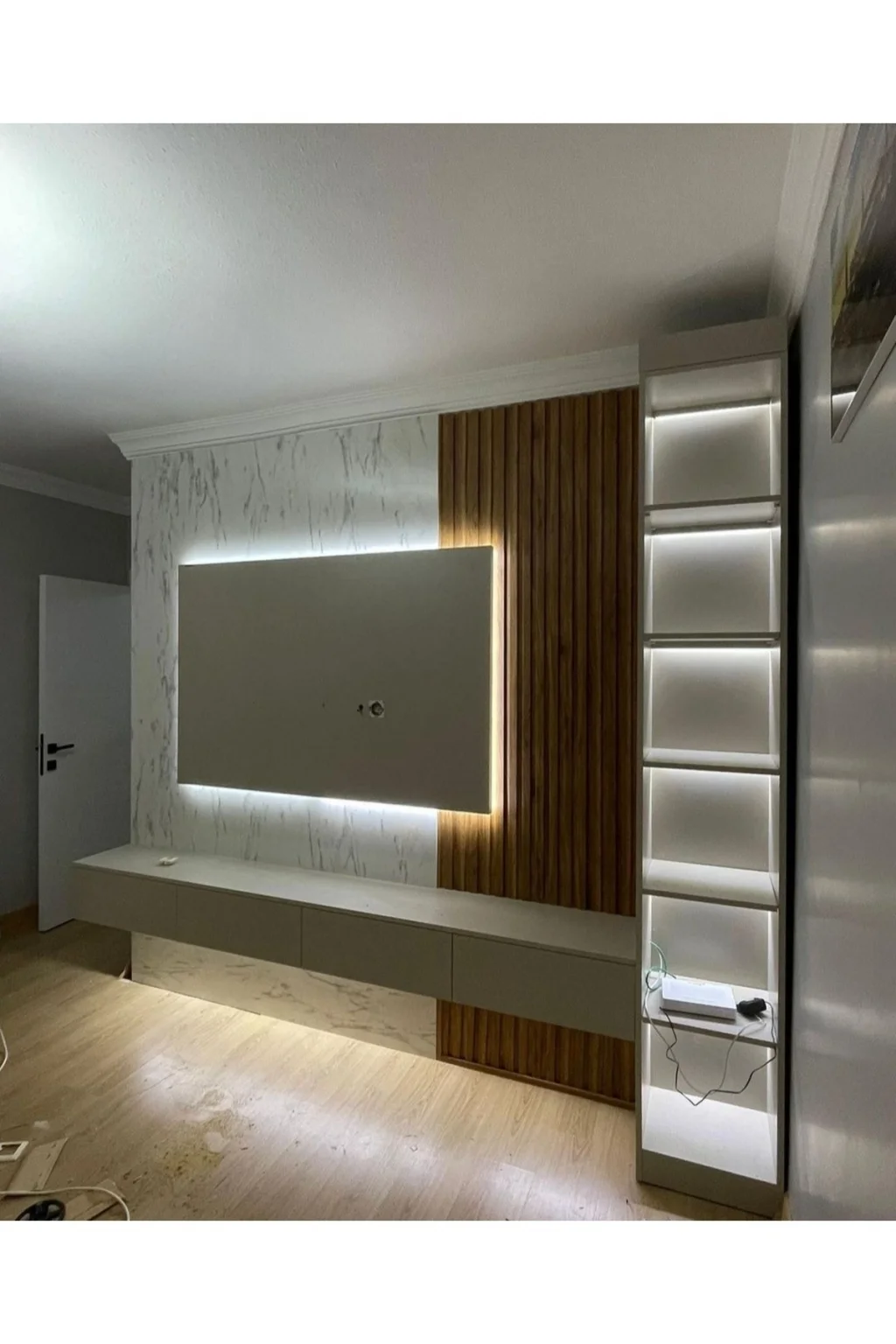 Ürün içeriğine TV ünitesi Duvar lambri LED'ler, TV Paneli dahildir.; Bizimle iletişime geçerek duvar ölçülerinize göre özel ölçülerde üretim yaptırabilirsiniz.; Ürünlerimiz tamamen 1. Sınıf MDF den üretilmektedir.; Duvar lambrim PVC malzemeden 280 cm uzunluğunda üretilmiştir.; Duvar yükseklik ölçünüze göre keserek kullanım yapmanız gerekmektedir.; TV Paneli 18mm kalınlığında MDF olarak üretilmiş LED'ler MDF üzerine kanal açılarak gömülmüş görünmeyecek şekilde dizayn edilmiştir.; TV paneli arkasına üçlü piriz montajı yapılmış tüm kablolar görünmeyecek şekilde tasarlanmıştır.; LED'ler ürün üzerine döşenmiş kanallara montajı yapılmış ve uçlarına soket takılarak gönderilmektedir.; TV ünitesinin ve Duvar Lambrilerinin montajını yaptıktan sonra LED'lerin soketlerini takarak yanmaya hazır hale getirebilir TV paneli yanındaki anahtardan açıp kapma işlemini yapabilirsiniz.; Hiçbir kesme lehim gibi işlemler yapmanız gerekmemekte bütün işlemleri yapılmış hazır halde gönderilmektedir.; Özenli paketleme ile ürünleri siz müşterilerimize ulaştırmaktayız hasar görme durumunda bizimle iletişime geçtiğiniz taktirde hasar gören parçaların yeniden temini sağlanmaktadır.; Resimlerde eklenmiş olan renk skalasından Duvar Lambri, TV Ünitesini, TV paneli ve LED renklerini seçebilirsiniz.; Alt TV ünitesi 200cm genişlik 32cm derinlik 40 cm yükseklik.; LED'li TV paneli 140 cm genişlik105 cm yükseklik.; Duvar lambri 60 cm genişlik 280cm yükseklik.; Yan raf 200cm yükseklik 32 cm derinlik 30 cm genişlik.