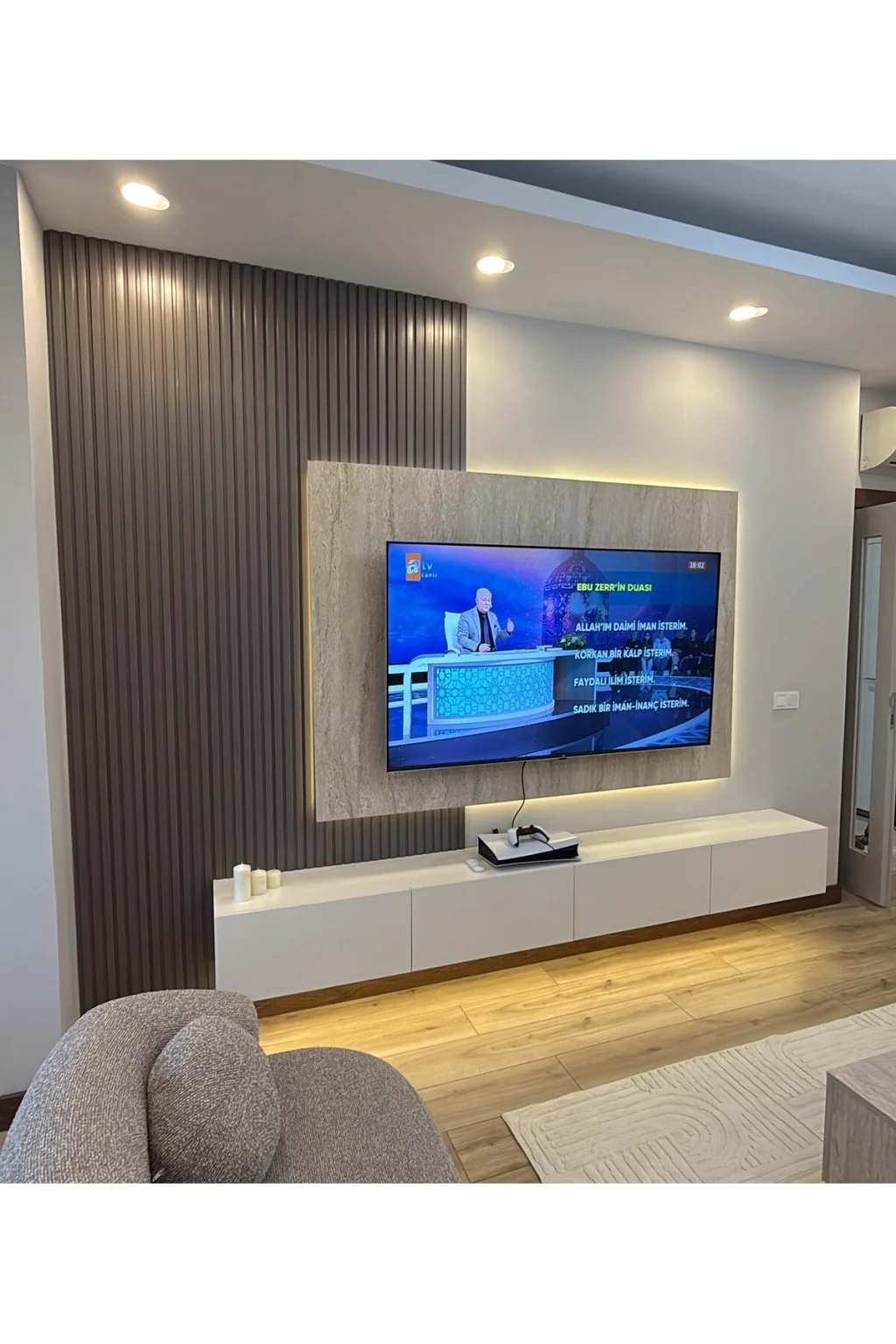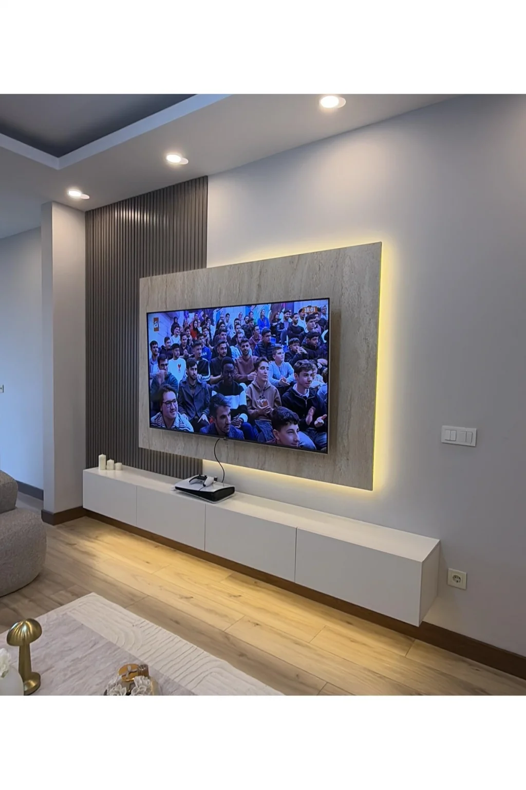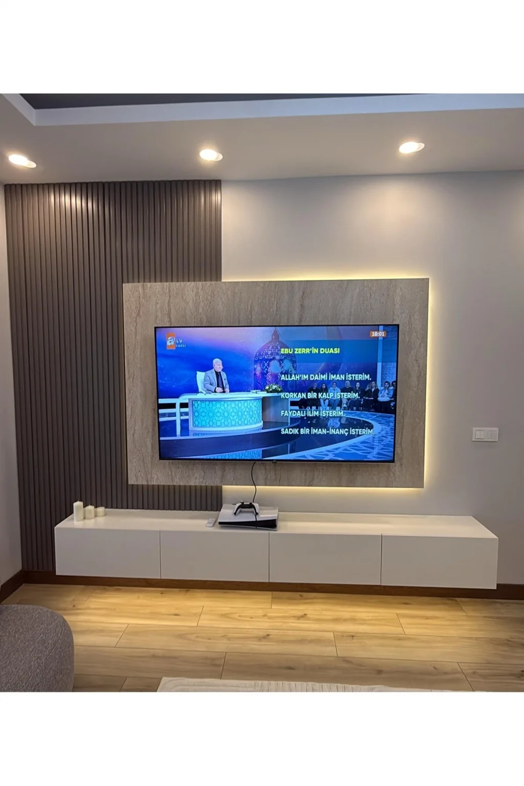 Ürün içeriğine TV ünitesi Duvar lambri LED'ler, TV Paneli dahildir.; Bizimle iletişime geçerek duvar ölçülerinize göre özel ölçülerde üretim yaptırabilirsiniz.; Ürünlerimiz tamamen 1. Sınıf MDF den üretilmektedir.; Duvar lambrim PVC malzemeden 280 cm uzunluğunda üretilmiştir.; Duvar yükseklik ölçünüze göre keserek kullanım yapmanız gerekmektedir.; TV Paneli 18mm kalınlığında MDF olarak üretilmiş LED'ler MDF üzerine kanal açılarak gömülmüş görünmeyecek şekilde dizayn edilmiştir.; TV paneli arkasına üçlü piriz montajı yapılmış tüm kablolar görünmeyecek şekilde tasarlanmıştır.; LED'ler ürün üzerine döşenmiş kanallara montajı yapılmış ve uçlarına soket takılarak gönderilmektedir.; TV ünitesinin ve Duvar Lambrilerinin montajını yaptıktan sonra LED'lerin soketlerini takarak yanmaya hazır hale getirebilir TV paneli yanındaki anahtardan açıp kapma işlemini yapabilirsiniz.; Hiçbir kesme lehim gibi işlemler yapmanız gerekmemekte bütün işlemleri yapılmış hazır halde gönderilmektedir.; Özenli paketleme ile ürünleri siz müşterilerimize ulaştırmaktayız hasar görme durumunda bizimle iletişime geçtiğiniz taktirde hasar gören parçaların yeniden temini sağlanmaktadır.; Resimlerde eklenmiş olan renk skalasından Duvar Lambri, TV Ünitesini, TV paneli ve LED renklerini seçebilirsiniz.; Alt TV ünitesi 200cm genişlik 32cm derinlik 30 cm yükseklik.; LED'li TV paneli 140 cm genişlik105 cm yükseklik.; Duvar lambri 100 cm genişlik 280cm yükseklik.; Yan raf 200cm yükseklik 30 cm derinlik 30 cm genişlik standart ölçülerdir